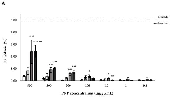 The obtained results showed that the hemolysis was higher in the presence of NLPs in comparison to PNPs, testing the same concentration. Working with both the studied nanocarriers, there was a direct correlation between the concentration of the payload and the toxicity on the erythrocytes. Figure 4A shows that in the case of PNPE, there was a direct correlation between hemolysis percentage and PNP concentrations, especially for the concentration of 500, 300, and 200 µgBSA/mL. Regarding the BSA-loaded PNPs, among all the different nanoparticle samples, 500 µgBSA/mL resulted to have a higher hemolytic activity in comparison with the same concentration of the PNPE (p < 0.05). Furthermore, the hemolytic activity of PNP produced at BSA concentration in the water internal solution of 40 mg/mL (PNPBSA (40 mg/mL)) was higher even at the concentrations of 300 and 200 µgBSA/mL. For all the tested samples, a hemolytic activity lower than 5% was reported and the formulated PNPs can be considered non-hemolytic at the tested concentrations [].