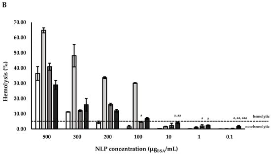 Conversely, NLPs showed a hemolytic behavior, even for the empty sample at different concentrations. Concentrations of NLPs equal to 500, 300, and 200 µgBSA/mL presented a hemolysis percentage over 5 (Figure 4B). This trend was reported even in the case of BSA-loaded NLPs, but in addition for the loaded liposomes also 100 µgBSA/mL concentration presented a hemolysis percentage over 5. The higher values of hemolysis reported for NLPs were probably caused by oxidation of their lipidic layer.