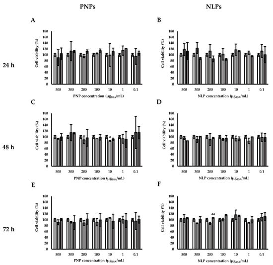 Cell viability of PNPs and NLPs by MTS assay after (A,B) 24, (C,D) 48, and (E,F) 72 h.