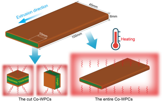 The thermal expansion measured using TMA was unsuitable for the Co-WPCs samples due to their large sizes. The entire Co-WPC samples (100 × 45 × 6 mm3) were first measured at their original sizes at 25 °C, and then their expanded sizes were recorded after being heated in an oven at 60 °C for 24 h to calculate the thermal expansion ratio. The thermal expansion of the entire Co-WPC samples along the thickness and extrusion direction (length) was measured (Figure 1).