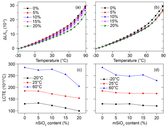 The LCTE was obtained from the slope of the linear portion of the thermal expansion strain curve (Figure 2c,d). The LCTE of all samples increased upon increasing the temperature from −20 to 60 °C, illustrating the temperature sensitivity of the polymer LCTE. However, the LCTE significantly decreased upon increasing the nSiO2 content, especially at 60 °C (≈60% decrease). Similar to the thermal expansion strain, the LCTE only moderately decreased after the addition of mSiO2, indicating that the LCTE of the WPCs depended mainly upon the polymer matrix [17]. In addition, using low-LCTE rigid fillers may reduce the thermal expansion of the resulting polymer composites [9,13,15,29].
