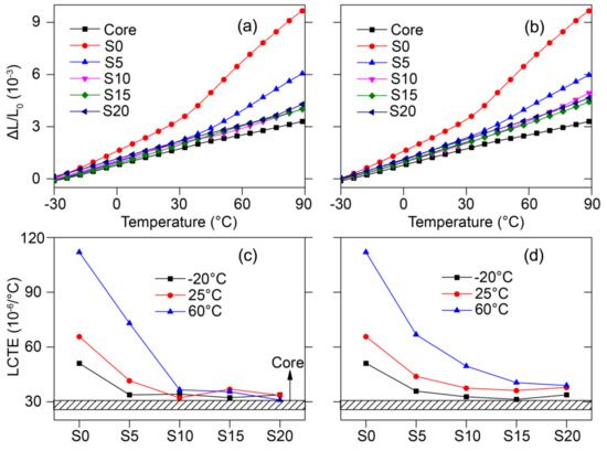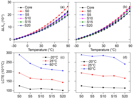 Thermal expansion strain of the shell layer samples: (a) nSiO2 and (b) mSiO2 fillers in shell layer, and LCTE as a function of silica content: (c) nSiO2 and (d) mSiO2 fillers in the shell layer.
