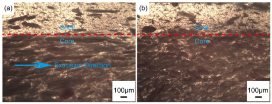 Thin sections with a thickness of 0.10–0.13 mm were cut from the Co-WPC profiles along and cross-planar transverse to the extrusion direction, respectively. The core–shell interface and wood fiber orientation were measured by a SMART-POL optical microscope (Chongqing Optec Instrument Co., Ltd., Chongqing, China).