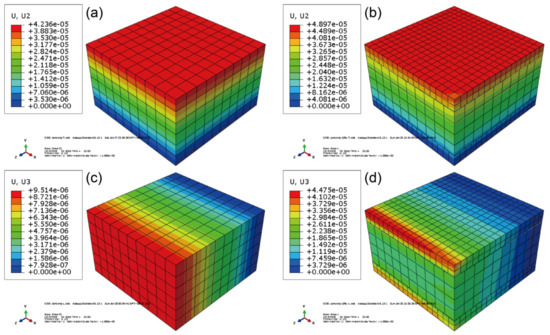 Simulated thermal expansion strain of the cut Co-WPCs in the thickness direction: (a) single core layer and (b) Co-WPCs (S0); in the extrusion directions: (c) single core layer and (d) Co-WPCs (S0).