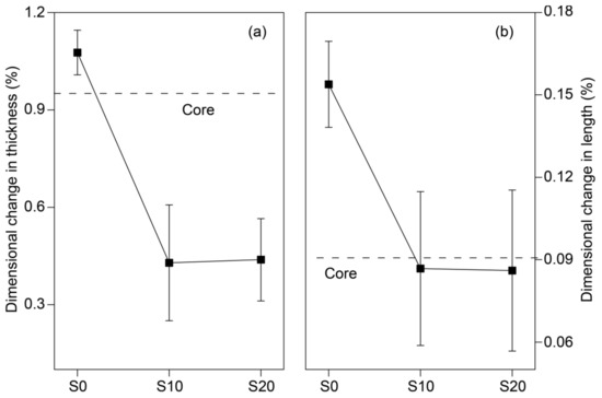 The co-extruded sample (S0) exhibited a 16.41% higher thermal expansion strain at 90 °C than the pure core layer in the thickness direction (Figure 3a). This was attributed to the small amount of wood fiber in the shell layer, which had only a slight stiffness. Incorporating nSiO2 in the shell considerably decreased the thermal expansion strain of Co-WPCs because of its smaller size effect, which was lower than the core layer, and S20 showed the largest decrease. Adding mSiO2 in the shell only slightly decreased the thermal expansion strain compared with nSiO2, but it was still higher than the pure core layer (Figure 3b). The lack of a positive effect of mSiO2 on the LCTE can be viewed as the absence of nanoscale effects, which is consistent with the shell layer results. Since the enhanced mechanical properties of the shell contributed to those of the entire Co-WPC [7,8], these results illustrate that incorporating rigid SiO2 in the shell layer can substantially improve the thermal expansion resistance of the Co-WPCs.