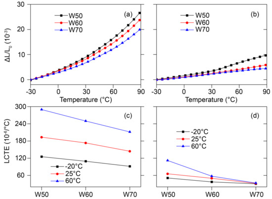 Thermal expansion strain as a function of temperature of Co-WPCs with high filler content: (a) in the thickness and (b) length directions, and LCTE in the thickness (c) and length directions (d).