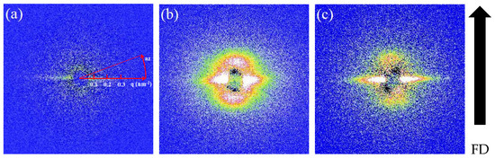 The 2D small-angle X-ray scattering (SAXS) patterns obtained immediately after flow with different durations of (a) 2, (b) 4, and (c) 6 s. The flow direction (FD) is vertical.