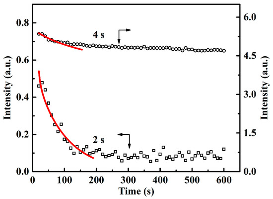 Time evolution of the equatorial streak integral intensity for flow time ts of 2 and 4 s. The open symbols are experimental data and the red solid lines are the fitting results with the modified Doi–Edwards memory function.