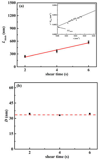 The change of shish (a) length Lshish and (b) diameter D with the shear time. The length and diameter of shish were obtained after the shearing stopped immediately. The red solid line is the fitting result. The red dashed line is used to guide the eye. The insets show examples of using Equation (5) to obtain the shish length Lshish.