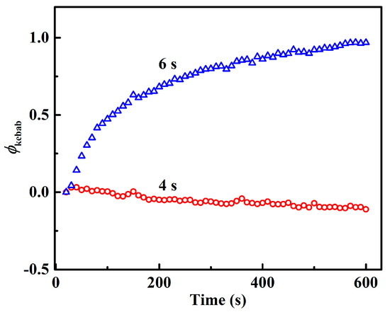 Moreover, the kebab structure is also formed under different shearing conditions. To trace the evolution of kebab during the isothermal period after flow, the scattering intensity in the meridian direction of different 2D SAXS patterns are integrated. The expression of the meridian integral intensity Ime is Ime = dazdq. Next, the variation of integrated kebab intensity can be expressed by the following method , where Ime(0) and Ime(t) are the integrated intensity of the meridian streak at the moment when the flow stops and at time t, respectively. Figure 6 displays the evolutions of ϕkebab during the isothermal process after flow, where no meridional intensity of kebab is observed for 2-s flow. It is found that the evolutionary trend of kebab is similar to that of the corresponding shish. For a shear time of 2 s, there is no kebab signal observed during the whole isothermal period, even when shish do not relax. This indicates that although shish are generated by the flow of 2 s, they are not able to nucleate the growth of kebab during the subsequent isothermal process. When ts = 4 s, kebab lamellae are generated with the flow, but the integral intensity shows a slow decrease after flow, which is essentially similar to the decrease in corresponding shish structure (ts = 4 s). During flow, polymer chains are oriented and stretched, the kebab also grows. However, after flow, polymer segments can quickly relax, as indicated by the very short relaxation time of only 0.048 s. However, when the shear time is 6 s, kebab integral intensity increases rapidly at first, and then increases slowly. The stability of both shish and kebab have the similar thermal dependence (to melt or grow simultaneously) on flow time.