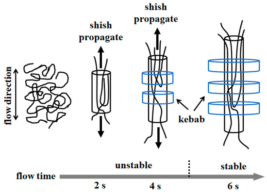 Schematic illustration of the development of shish-kebab structure affected by different flow time.
