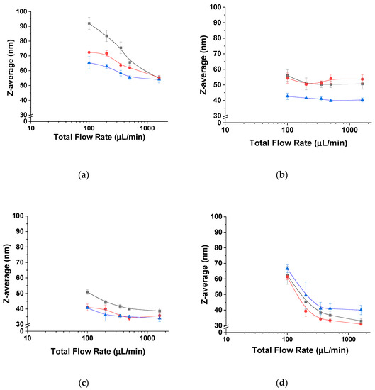 Average hydrodynamic diameter of mPEG5K-b-p(HPMA-Bz)X nanoparticles as a function of flow rate. (a) mPEG5K-b-p(HPMA-Bz)17.1K, (b) mPEG5K-b-p(HPMA-Bz)10.0K, (c) mPEG5K-b-p(HPMA-Bz)5.2K and (d) mPEG5K-b-p(HPMA-Bz)2.7K. Black square: 5 mg/mL, red circle: 10 mg/mL and blue triangle: 20 mg/mL block copolymer in THF.