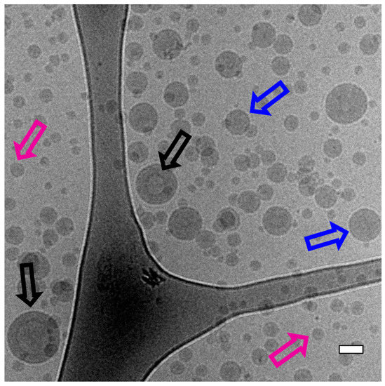 Cryo-TEM overview picture of block copolymer A (mPEG5K-b-p(HPMA-Bz)17.1K) nanoparticles prepared at a concentration of 5 mg/mL and a flow rate of 100 µL/min. Black arrows point to vesicles such as polymersomes, blue arrows point to bigger micelles and the purple arrows point to smaller filled micelles. Scalebar indicates 50 nm.