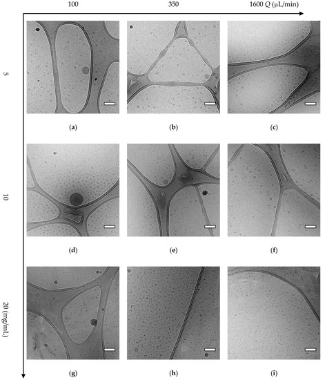 Cryo-TEM pictures of polymer A (mPEG5K-b-p(HPMA-Bz)17.1K) nanoparticles prepared using different polymer concentrations and flow rates. (a) 5 mg/mL and 100 µL/min, (b) 5 mg/mL and 350 µL/min, (c) 5 mg/mL and 1600 µL/min, (d) 10 mg/mL and 100 µL/min, (e) 10 mg/mL and 350 µL/min, (f) 10 mg/mL and 1600 µL/min, (g) 20 mg/mL and 100 µL/min, (h) 20 mg/mL and 350 µL/min, (i) 20 mg/mL and 1600 µL/min. Scale bars indicate 50 nm.