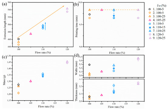 | No. | Printer | vprint (mm s−1) | f (%) | o (%) | Extrusion Length, LE (mm) | Line Count | Layer Count | Printing Time, t | Volumetric Flow Rate, Qflow, 1 (mm3 s−1) |