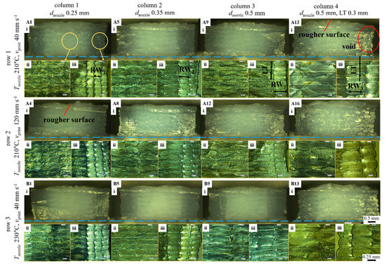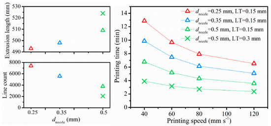 | No. | dnozzle (mm) | LT (mm) | vprint (mm s−1) | Extrusion Length, LE (mm) | Line Count | Layer Count | Printing Time, t | Volumetric Flow Rate, Qflow 1 (mm3 s−1) |