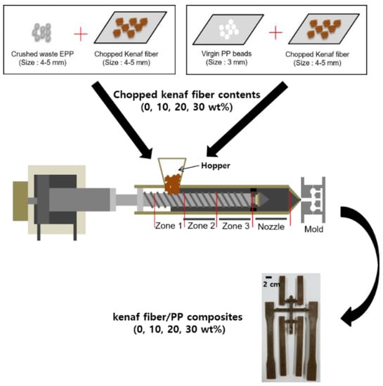 Polypropylene (PP) is one of the most frequently used general-purpose thermoplastics in many industrial applications. It can often be produced via extrusion and injection molding processes not only with glass and carbon fibers, but also with natural fibers. Several papers have dealt with PP and kenaf fiber to make the composite. Most recently, Nematollahi et al. reported that composites with neat PP and 20 wt% kenaf fiber were fabricated by using extrusion injection molding and carried out experimental and numerical studies of the critical fiber length to affect the load transfer efficiency and stiffening of resulting composites [16]. They also studied that morphology, thermal, and mechanical properties of extruded injection molded kenaf fiber reinforced PP composites [17]. Radzuan et al. investigated focusing on machinability and moldability of kenaf composites with PP, PLA, and epoxy for automotive components, which was produced by injection and compression molding processes [18]. Islam et al. characterized the effect of alkali-treatment on the interfacial and mechanical properties of kenaf/recycled PP composites made by using extrusion and injection molding methods [19]. However, kenaf fiber composites with waste expanded polypropylene (EPP) have been rarely found.