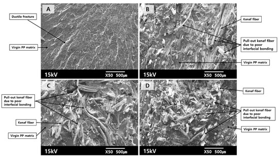 SEM images (×50) of the fracture surfaces of kenaf fiber/PP composites produced using waste EPP with various kenaf fiber contents ((A): 0, (B): 10, (C): 20, (D): 30 wt.%).