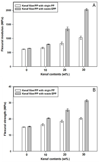 Flexural modulus (A) and strength (B) of kenaf fiber/PP composites produced using virgin PP and waste EPP with various kenaf fiber contents.