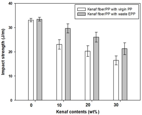 Figure 6 compares the Izod impact strengths of kenaf fiber/PP composites produced using virgin PP and waste EPP. The impact strengths of both composites were similar, showing the values of 33 and 34 J/m, respectively. The impact strength was gradually decreased with increasing the kenaf fiber contents, unlikely with the flexural result. The deceasing tendency of the impact strength by adding brittle natural fibers including kenaf to a ductile thermoplastic matrix was often found in other natural fiber composites, as reported earlier [35,36].