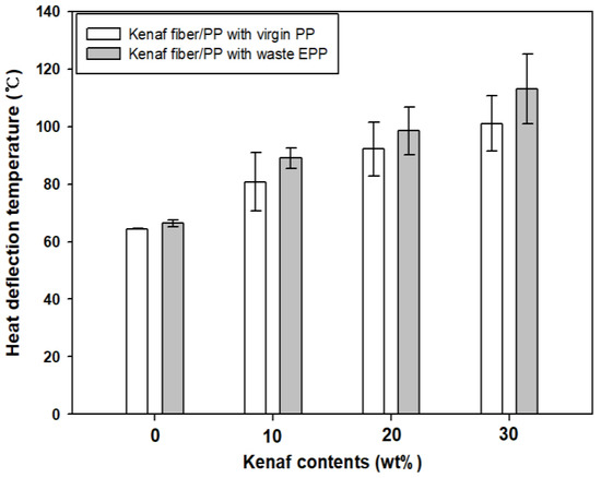 Figure 7 compares the HDT of kenaf fiber/PP composites produced using virgin PP and EPP waste. The HDT values without kenaf fiber (0 wt.%) were 64 °C with virgin PP and 66 °C with EPP waste. In both cases, the HDT was gradually increased with increasing the kenaf fiber contents due to the reinforcing effect, as similarly found in other fiber/polymer composites [29,30,40]. The increasing tendency of the HDT was similar with that of the flexural properties, as above-mentioned. The HDT result indicated that with increasing the kenaf fiber contents the composites were increasingly resistant to the 3-point flexural loading applied to the composite specimens exposed to elevating temperature environment in a silicone oil bath. At 30 wt.% kenaf fiber, the HDT (113 °C) of the composite with waste EPP was about 12% higher than that (101 °C) of the composite with virgin PP.