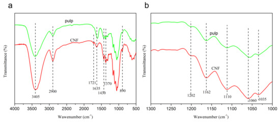 FT-IR spectroscopy was used to characterize the chemical bonds of the pulp and CNF. The infrared spectra of the raw material (pulp) and CNF obtained in this study are shown in Figure 2. As can be seen, the FT-IR spectrum indicated that the prepared CNF had the same characteristic cellulose absorption peak as the pulp. The characteristic absorption peaks at 3405, 2900, 1430, 1162, 1110, and 890 cm−1 seen in Figure 2a can be attributed to the cellulose Iβ structure [31]. The peaks at 1635 cm−1 represent the bending vibration peak of –OH in water molecules. This was mainly caused by the absorption of water molecules by the hydrophilic groups in the cellulose molecules [32]. In addition, the peaks around 1202, 1162, and 1060 cm−1 represent the shear vibration peak, asymmetric vibration peak, and stretching vibration peak generated by CH2, C–O–C, and C–O on the cellulose epoxy structure C6, respectively [33,34]. The sharp peaks observed at 1370 cm−1 represent the C–H bending vibration. The peak at 1721 cm−1 can be attributed to the C=O stretching vibration peak of the carboxyl group. The –O–O– bond in ammonium persulfate is very unstable and can be broken down to form hydrogen peroxide and oxygen atoms with a highly oxidizing nature under heating conditions. This could have oxidized the primary alcohol hydroxyl group in the cellulose molecules into carboxyl groups, such as aldehyde.