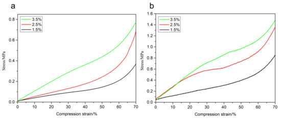 It can be seen from Figure 5 that the mechanical properties of the CNF aerogel enhanced with the increase in the mass fraction of CNF. The compression strength values of the aerogels with the mass fractions of 1.5%, 2.5%, and 3.5% prepared by the supercritical CO2 drying process were found to be 0.37, 0.67, and 0.77 MPa, respectively, when the compression ratio was 70%. In the liquid nitrogen freeze-drying process, the aerogels with the mass fractions of 1.5%, 2.5%, and 3.5% showed compression strength values of 0.85, 1.32, and 1.47 MPa, respectively, at a compression ratio of 70%. This can be mainly attributed to the presence of a large number of hydroxyl groups on the CNF surface, resulting in the formation of hydrogen bonds in the gelation process and cross-linking within the hydrogels to form a three-dimensional network structure [37]. Within a certain range, the number of hydrogen bonds formed between the cellulose in the hydrogels increased with concentration. The enhancement of physical cross-linking between each other resulted in the formation of a more compact internal network skeleton. Therefore, the mechanical properties of the aerogels enhanced with the increase in concentration. As the mass fraction of CNF ranged from 1.5% to 2.5%, there was greater enhancement in the compression strength of the aerogel compared to those with the CNF mass fractions in the range of 2.5% to 3.5%. The analysis showed that the internal structure of the aerogel was relatively loose for low mass fraction values of CNF. The increase in concentration resulted in a more compact internal structure. However, there was no obvious improvement in the internal structure as the density reached the maximum after a certain value of the mass fraction. For the same mass fraction, the aerogel compression strength after liquid nitrogen freeze-drying was greater than that under the supercritical CO2 drying process. This may be attributed to the formation of ice crystals by the CNF hydrogels during the freeze-drying method that changed the internal pore structure of the aerogel. Due to cellulose aggregation, the compression strength was increased.
