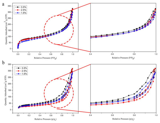 It can be seen from Table 2 that the condensation rate of the CNF aerogels by the liquid nitrogen freeze-drying process decreased with the expansion of the mass fraction of CNF. When the mass fraction of CNF was 1.5%, the drying shrinkage of the hydrogel was found to be maximum. When the mass fractions of CNF were 2.5% and 3.5%, the drying shrinkage of the hydrogels was similar. A similar variation in the shrinkage rate was observed for hydrogels resulting from the supercritical CO2 drying process. For the same mass fraction of CNF, the shrinkage rate of the liquid nitrogen freeze-drying technique was higher than that of the supercritical CO2 drying process. This was due to the difference in the mechanism of the two freeze-drying methods. In addition, the specific surface area increased with the mass fraction of CNF, but the rate of elevation gradually decreased. Moreover, the pore volume decreased, and the density increased with the expansion of the mass fraction of CNF. In the freeze-drying process, the inner network structure of the CNF aerogel was denser with the extension of the CNF mass fraction, which further enhanced its strength. Therefore, the specific surface area and density increased as the pore volume decreased. For the same mass fraction of CNF, the specific surface area, pore volume, and density of the aerogels obtained by the liquid nitrogen freeze-drying process were reduced compared to the supercritical CO2 drying method. This can be mainly attributed to the high shrinkage of CNF aerogel under the liquid nitrogen freeze-drying technique, which destroyed the three-dimensional network structure within the aerogel.