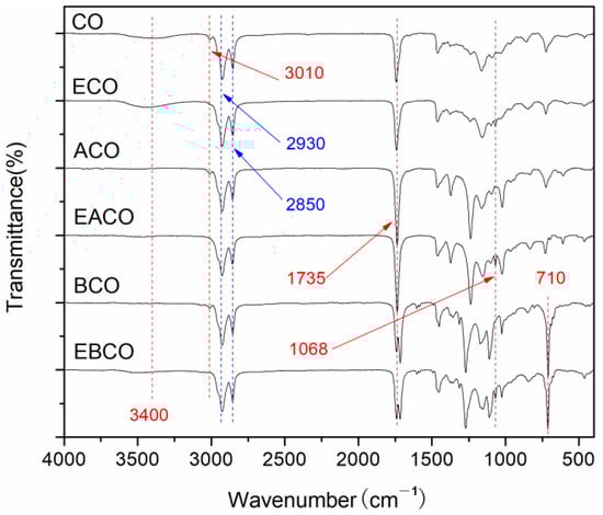 The FT-IR spectra of CO, ECO, ACO, EACO, BCO, and EBCO are shown in Figure 1. In all the spectra curves, the methylene at 2930, 2850 cm−1 and carbonyl at 1735 cm−1 indicated the integrity of the main chain of the castor oil molecule. In the spectra of ACO, EACO, BCO, and EBCO, the hydroxyl group at 3400 cm−1 almost disappeared, illustrating that an acylation reaction had occurred. At 710 cm−1 is the bending vibration peak of the hydrocarbon in the monosubstituted benzene ring after benzoylation reaction. The carbon-carbon double bond of CO, ACO, and BCO at around 3010 cm−1 disappeared, while the epoxy group at 1068 cm−1 appeared in the spectra of ECO, EACO, and EBCO, demonstrating that the carbon-carbon double bonds were oxidized into epoxy groups.