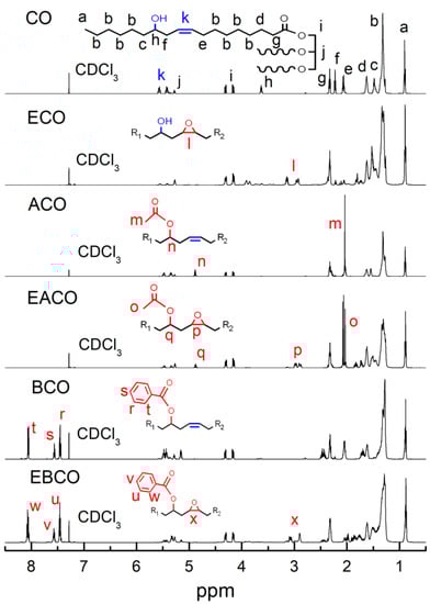 Figure 2. 1H NMR spectrum of CO, ECO, ACO, EACO, BCO, and EBCO.