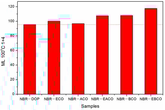 The Mooney viscosity of different NBR compounds are given in Figure 3. The Mooney viscosity of the NBR-DOP compound was 95.52, while that of the NBR-ACO compound was 96.81, which meant that the plasticizing effect of the ACO plasticizing NBR compound was close to that of the DOP. The Mooney viscosity of NBR compounds plasticized by other four plasticizers was higher than that of DOP, indicating that the plasticizing efficiency is lower than DOP, which may be related to the viscosity of the plasticizer [21]. As shown in Table 1, the viscosity of DOP was 80, and the viscosities of ACO, EACO, BCO, and EBCO increased sequentially, as did the NBR compounds. Nevertheless, ECO was an exception, mainly because of the hydroxyl groups in ECO, which improved the compatibility of the plasticizer and NBR, and reduced the Mooney viscosity of the mixed rubber.