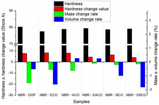 The NBR vulcanizates were aged for 72 h in a circulating hot air environment at 100 °C, and then changes in hardness, mass, and volume of the samples were measured as shown in Figure 4; the mechanical properties after aging are listed in Table 4. The mass, volume, and hardness changes of the NBR-DOP vulcanizate after hot air aging were −1.51%, −0.51% and 7.8 A, respectively. Compared with NBR-DOP, the mass loss of vulcanizates plasticized by five castor oil-based plasticizers were less, which shown that the compatibility of the five castor oil-based plasticizers with NBR is better than that of DOP. This is because the synthetic plasticizers contain a large number of ester bonds and epoxy groups, which make plasticizers have more compatibility with NBR than DOP. Based on the mass, volume, and hardness change data, NBR-EACO had better heat-resistant air aging performance. The change rates of mass, volume, and hardness were −0.10%, 0.26% and 4.5 A, respectively, and less than that of NBR-DOP. After hot air aging, the tensile strength of the vulcanizates increased, but the elongation at break decreased significantly. This was mainly because during the hot air aging process, the samples continued to be vulcanized and crosslinked [23]. The change rates of tensile strength and elongation at break of NBR-DOP were 10.48% and −46.50%, while other vulcanizates had a smaller change in elongation at break and a wide variation in tensile strength. In general, the hot air aging performance of the NBR vulcanizates containing epoxy group plasticizers was significantly better than that of DOP.