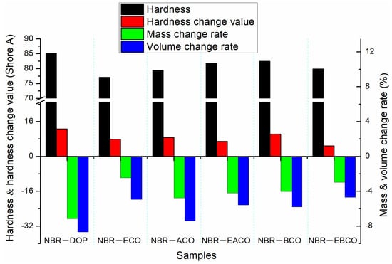 After immersing the NBR vulcanizate samples in ASTM 1 oil and aging at 100 °C for 72 h, the changes in hardness, mass, and volume of the samples are shown in Figure 5. The mass and volume of the NBR vulcanizates after hot oil aging varied greatly, which was because the plasticizers migrated to the oil when the samples were immersed in the polar ASTM 1 oil. The changes of NBR-DOP in mass, volume, and hardness after hot oil aging were −7.15%, −8.68%, and 12.7 A. The mass, volume, and hardness changes of vulcanizates plasticized by five castor oil-based plasticizers were smaller than those of NBR-DOP, which indicated that the NBR vulcanizates containing castor oil-based plasticizers have better oil migration resistance. According to Table 5, the tensile strength of the vulcanizates increased, but the elongation at break greatly reduced. This was mainly because in the process of hot oil aging, there also was the migration of plasticizers in addition to the thermal cracking of the crosslinking network. The change rates of tensile strength and elongation at break of NBR-DOP were 15.48% and −46.51%. Meanwhile, the variation of mechanical properties of other samples were almost less than that of NBR-DOP. All the oil aging properties manifested that castor oil-based plasticizers can improve the thermal oil aging stability of NBR vulcanizates.