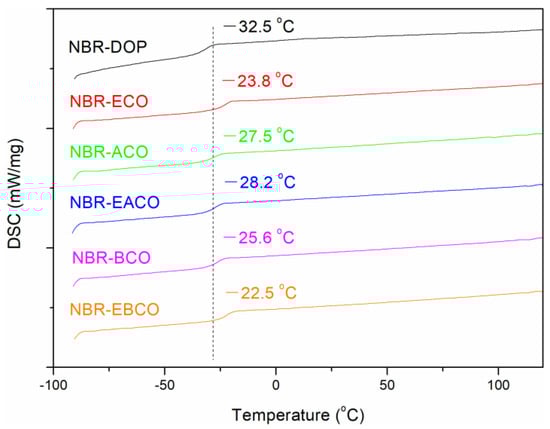 The glass transition temperature (Tg) of NBR vulcanizates was measured by DSC; the DSC thermograms are presented in Figure 6. Obviously, the DSC thermogram of every sample exhibited an inflection point, which showed that the plasticizers were compatible with NBR. The Tg of NBR-DOP was −32.5 °C, while the samples containing castor oil-based plasticizers were slightly higher than that of DOP. This might be due to the higher Tg of the castor oil-based plasticizers than DOP (shown in Table 1, except ACO, −73.3 °C). On the other hand, the castor oil-based plasticizers contained carbon-carbon double bonds and epoxy groups, which might participate in the vulcanization process. Therefore, the plasticizers were distributed in the vulcanizates in the state of chemical crosslinking [16].