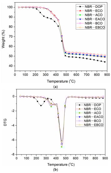 The TGA curves of different NBR vulcanizates are shown in Figure 7 and the thermal performance data, including the weight loss of 10% (T10%), weight loss of 50% (T50%), and the residue at 900 °C are summarized in Table 6. The thermal weight loss of each vulcanizate was divided into two sections. The first section at 300–400 °C was the volatilization and decomposition of small molecules such as plasticizers, and the second section at 400–500 °C was the decomposition of the polymer molecular chain [24]. The first thermal weight loss temperature of NBR-DOP was 297.3 °C, while the NBR vulcanizates containing castor oil-based plasticizers had a peak temperature of 390–405 °C, which was about 100 °C higher than that of NBR-DOP. The higher temperature of initiation of degradation of these mixes was possibly because there were more physical and chemical crosslink points between the synthetic castor oil-based plasticizer and NBR, which was attributed to the interaction between the oils and NBR [15,25]. On the other hand, the castor oil-based plasticizers have a large molecular weight and a high vaporization point then that of DOP. It can be seen from Table 6 that the second thermal weight loss peak temperature of each vulcanizate was relatively close, and NBR-DOP was only about 5 °C lower than that of the other samples, which was mainly due to the heat resistance of the ester bonds in the castor oil-based plasticizers. At 900 °C, the residue of NBR-DOP was about 4–6% lower than others, which demonstrated that castor oil-based plasticizers can improve the thermal stability of NBR.