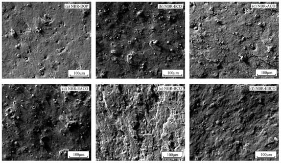 Figure 8. SEM images of (a) NBR-DOP, (b) NBR-ECO, (c) NBR-ACO, (d) NBR-EACO, (e) NBR-BCO and (f) NBR-EBCO.