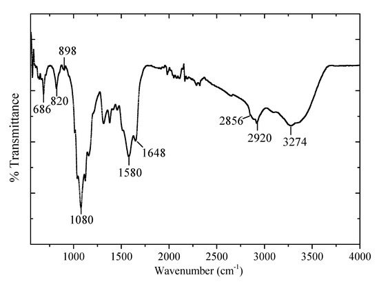 Figure 2 depicts the FTIR spectrum of the chitosan-PEG blend. The broad peak at 3274 cm−1 is due to the N–H stretching and O–H stretching vibrations of the chitosan and PEG [21]. The broadness is further confirming the association of the two polymeric materials. Moreover, the peaks at 2920 and 2856 cm−1 are attributed to the asymmetric and symmetric C–H stretching, respectively [22,23]. The peak at 1080 cm−1 could be attributed to the C–O stretching of ether group for PEG while the peaks 898 and 820 cm−1 could also be attributed to the similar PEG characteristics’ peaks observed previously [21,22].