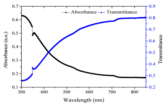 Figure 3 shows the absorption and transmittance spectra of the chitosan-PEG. It is reported that chitosan featured no absorption peak within 300–900 nm [24]. However, the minor peak observed around 350–400 nm could be attributed to the presence of PEG [25,26]. On the other hand, the transmittance value of the material indicates its promising application in the visible range [27].