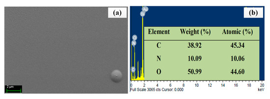 The surface morphology and EDX spectrum of the chitosan-PEG are shown in Figure 4a,b, respectively. Figure 4a shows no obvious feature for the chitosan-PEG surface. This could be due to the flatness nature of chitosan films and it is consistent with the previous work [28,29]. In addition, it confirms the absence of bubbles in the chitosan-PEG blend [29].