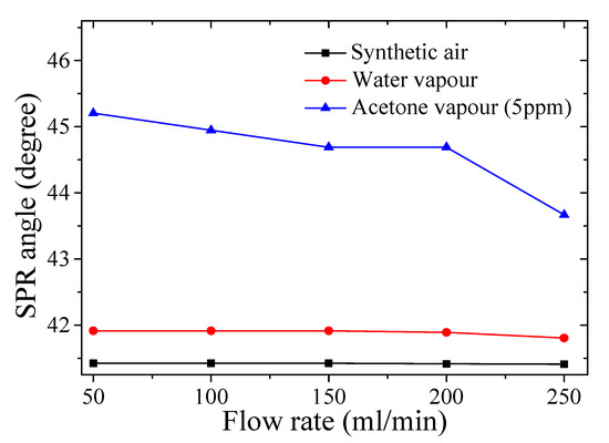 Figure 5 shows measured SPR angle at various flow rates in the range of 50–250 mL/min for the synthetic air, water vapor, and 5 ppm acetone vapor. It was observed that the highest SPR angle was recorded at the flow rate of 50 mL/min for all the analytes at the recorded chamber temperature of about 29.0 °C. The measured relative humidity (RH) % values in the chamber for the synthetic air (carrier gas), water vapor, and 5 ppm acetone vapor were about 20.09% RH, 92.81% RH, and 87.50% RH, respectively. As such, all the subsequent chitosan-PEG-based SPR measurements were conducted under these conditions.