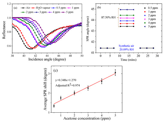 Prior to the investigation of the chitosan-PEG-based sensor response to the various concentrations of acetone vapor, the steady condition for the SPR measurement and the restoration of the sensing layer were achieved by allowing 5-min exposure to the analytes and synthetic air, respectively [15]. The SPR response of chitosan-PEG sensing layer to dry air (synthetic air at 20.09% RH) different, water vapor (humidified air at 92.81% RH), and to acetone vapor concentrations from 0.5 ppm to 5 ppm in humidified air (at 87.50% RH) was measured, as shown in Figure 6a. A positive SPR shift was observed with the increase in the concentration of the acetone vapor. The SPR shift was due to changes in the surface plasmon properties of the gold film plus absorbate relative to the gold film alone, as caused by the optical properties of the absorbed analyte as well as the change of the refractive index of the sensing layer [15].