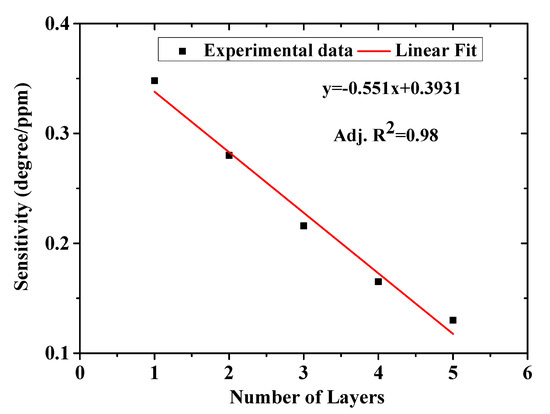 The result presented in Figure 6 is from a single layer of chitosan-PEG deposited at 6000 rpm for 30 s. In order to investigate the effect of layer thickness on the sensitivity of the chitosan-PEG-based SPR sensor, four different chitosan-PEG sensing layers with 2, 3, 4, and 5 layers deposited on top of the first layer to increase thickness were also prepared and tested. Figure S4a,b shows the effect of the number of layers on the SPR curves and the sensitivity, respectively. The results are summarized in Figure 7 and Table 2. It could be observed from Table 2 that the full width at half maximum (FWHM) increases with number of layers, which is attributed to the increase in the thickness of the chitosan-PEG sensing layer. From Figure 7 it can be observed that the sensitivity decreases with number of chitosan-PEG layers, which is in accordance with a result on the SPR detection of ethanol and isopropanol [37]. This could be due to the decrease of the penetration depth of the surface plasmon wave [12,14]. Based on the result presented in Figure 7 and Table 2, it could be concluded that single-layer chitosan-PEG-based SPR sensor is the best in terms of sensitivity, FWHM, and figure of merit (FOM).
