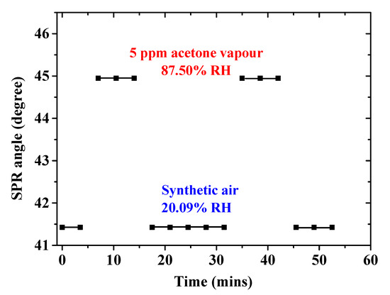 The SPR angle of the single-layer chitosan-PEG-based SPR sensor was evaluated in order to investigate the recovery, response, stability, and reversibility of the measurements [39,40,41]. The graph is shown in Figure 8 as a plot of SPR angle as a function of time [15,42]. Unfortunately, our SPR system setup could not provide SPR angle measurement data faster than 3.5 min after each run due to the need to control and adjust some of its components manually. Therefore, accurate response and recovery time values could not be determined. However, it could be observed from Figure 8 that both the response and recovery times would be less than 1 min each after exclusion of the 3.5 min. Excellent reversibility and recovery of the sensor was observed when the supply of the 5 ppm acetone vapor was ceased and replaced by the introduction of the synthetic air. Other concentrations of the acetone vapor also showed similar characteristics (Figure 6b).
