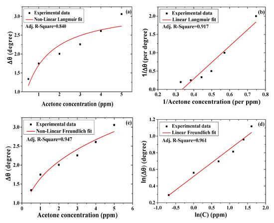 The investigation of the binding strength between the single-layer chitosan-PEG SPR sensor and acetone vapor was deduced from the plotting graph of the average SPR angle shifts as a function of the average acetone concentrations, shown in Figure 6c. This graph was fitted to the nonlinear and linear formats of the Langmuir and the Freundlich isotherm models, as shown in Equation (S1), (S2), (S3), and (S4), respectively [15,43]. The fits with low error value and higher correlation factor were regarded as the best [44]. Figure 9a–d shows the graphs for the nonlinear Langmuir fittings, linear Langmuir fittings, nonlinear Freundlich fittings, and linear Freundlich fittings, respectively. These results are presented in Table 3. As shown in Figure 9 and Table 3, the parameter Δθ is the SPR shift, Δθmax is the maximum SPR shift at saturation, C is the concentration of the analyte, and KD is the equilibrium dissociation constant. Affinity constant (KA) is the reciprocal of KD. In addition, 1/n is the heterogeneity factor [43,45]. A variation in the slope (1/n) between 0 and 1 is associated with a chemisorption process. When a slope above 1 is observed, then a physical absorption process is expected [46,47]. KF can be related to the strength of the adsorptive bond or adsorption capacity. Furthermore, Δθmax is measured in degree, KA is measured in ppm−1, and KD and KF are measured in ppm [15,48].
