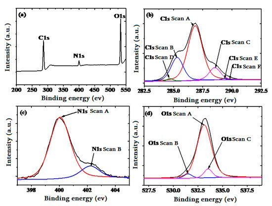 The knowledge of functional groups on the surface of the chitosan-PEG sensing layer is required for the prediction of the dominant interaction mechanism and the reason for a selective detection of the acetone vapor [50], and this is also accomplished by XPS characterization. Its spectra are shown in Figure 10. The assignment of various peaks is summarized in Table S3. The presence of the carbon, nitrogen, and oxygen in XPS scan spectrum confirms the existence of the chitosan-PEG blend [51]. Furthermore, the C 1s scan of the chitosan-PEG blend was resolved to the binding energies (BEs) of 286.69 eV (C–OH), 284.90 eV (C–NH, C–NH2 or C=C), 288.35 eV (C=O), 285.31eV (Contamination, C–C or C–H), and about 289 eV (O–C=O) [52]. Furthermore, the O1s peak was resolved to three peaks, which include the BEs of 533.13 (C=O), 531.49 (C–OH), and 533.53 (C–O) [52]. The presence of hydroxyl (OH) and C–NH further confirms the presence of chitosan [51,53]. The N1s peak was resolved to two different peak Bes’ positions at 400.05 eV and 402.21 eV, which could be attributed to Pyrollic–N (–NH–) and Pyridinic–N (=N–), respectively [51]. These abundant functional groups would play a vital role in the selective acetone vapor detection.