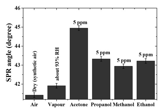 The cross-sensitivity (selectivity) of the single-layer chitosan-PEG SPR sensor to acetone was confirmed by investigating and comparing the response of the sensor to water vapor, 5 ppm propanol, 5 ppm methanol, and 5 ppm ethanol with that of 5 ppm acetone vapor. The selectivity graph is shown in Figure 11. It was observed that the maximum SPR angle in air, vapor (about 93% RH), acetone vapor, propanol vapor, methanol vapor, and ethanol vapor were 41.41, 41.95, 44.95, 43.95, 42.94, and 43.22 degrees, respectively. The exclusion of the humidity effect made the response of 5 ppm acetone to be about 33%, 66%, and 57% higher than that of 5 ppm propanol, 5 ppm methanol, and 5 ppm ethanol, respectively. The higher response of the chitosan-PEG SPR sensor to acetone could be attributed to the higher number of carbon atoms and the rate of evaporation [42,59]. The number of carbon atoms and the rate of evaporation for all the analytes are presented in Table 4 [42]. It could be observed that both the acetone and the propanol shared the same number of carbons, but acetone showed higher response due to its higher rate of evaporation. Furthermore, comparison among the alcohols (propanol, ethanol, and methanol) indicates the domination of the number of carbon atoms.