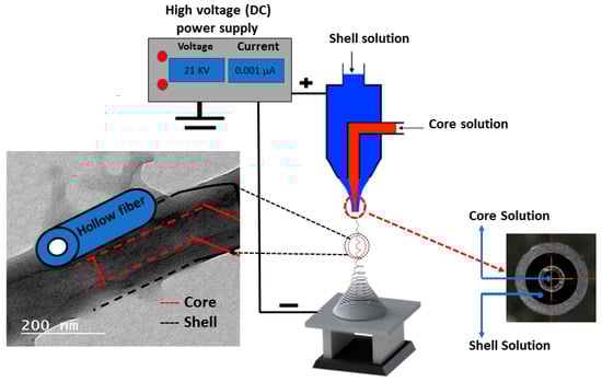 Scheme illustrating the electrospinning technique setup for engineering a coaxial nanofiber membrane.