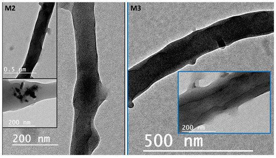 Coaxial electrospinning has been perceived as a productive engineering method to manufacture polymeric and composite nanofibers. Figure 2 shows FESEM images of the fabricated membranes; the electrospun nanofibers orientate randomly and overlap to form a fibrous network structure. The surfaces of the nanofibers demonstrated relatively smooth and beadless nanofibers using optimized solution concentrations related to core and shell M1 membranes (CA and PSf). The composite ZnO NP nanofibers based on polymer solution at the M2 and M3 membranes have a smooth fibrous distribution. Moreover, the treated membranes with NaOH solution are shown in Figure 2 (M4–M6) and have discontinuous fibers and film formations on the top layer of the membrane that contain ZnO NPs. Figure S1 shows FESEM images (at high resolutions) attributed to the M3 membrane with core and shell diameters of 102.4 nm and 323.1 nm, respectively. Interestingly, different membrane locations show that coaxial membranes have different morphologies after NaOH treatments, as shown in M4–M6 Figure 3. It is obvious that treatment using NaOH solution changed membranes’ morphology. For example, a polymeric membrane shows the disappearance of nanofibers and is covered with a porous structure. On the other hand, a composite coaxial fiber with shell polymer has thick and porous fibers structure. Furthermore, a coaxial fiber with shell composite of ZnO NPs resulted in novel nanosheets on the outer surface of the composite membrane. This is attributed to the driving force in the hydrothermal environment and the presence of the strong alkaline medium of NaOH [31]. Membranes characterized with TEM images for more understanding of coaxial nanofiber morphology are clear in Figure 4. Moreover, fibers obtained by the coaxial electrospinning of M2 have a clear image of core and shell fiber formation. TEM images of M3 have also been observed and show nanoparticles on the shell side attributed to ZnO NPs.