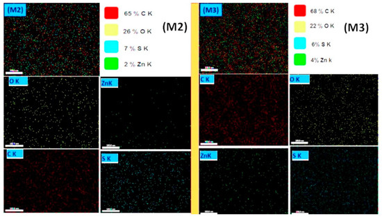 The EDS elemental mapping distributions of coaxial nanofiber membranes are shown in Figure 5. Images show homogeneous dispersion of ZnO in the ultrafine membranes fibers regrading the M2 membrane. Besides that, the EDS mapping of the M2 membrane shows that ZnO NPs were well distributed among the membrane material. The elemental composition of the M2 membrane shows the elemental composition of 65% C, 26% O, and 2% Zn, in which the core side has ZnO NPs. However, the M3 membrane shows a higher content of Zn—this is due to the outer shell composite fiber containing CA polymer and ZnO NPs. Figures S2 and S3 show elemental EDS point results of the developed membranes M1–M6 with the presence of all elements of the composite’s membranes.