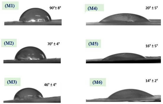 Membrane hydrophilicity plays a vital role in antifouling and permeability; as a result, membranes were evaluated using WCA measurements to assess surface hydrophilic and/or hydrophobic properties. Resulting WCAs of the different membranes (M1 to M6) have the following values: 90° ± 8°, 70° ± 4°, 46° ± 4°, 20° ± 5°, 16° ± 5°, and 14° ± 2°, respectively; the associated WCA images are shown in Figure 6. The resulting WCA of the M1 membrane shows 90° ± 8°—this decreased to 70° ± 4° after coaxial electrospinning of a shell from CA polymer and coaxial fibers in the M2 membrane, with similar reported results [32]. Addition of ZnO NPs to PSf and coaxial electrospinning with CA resulted in a lower WCA to 46° ± 4° for the M3 membrane [33]. Furthermore, surface hydrophilicity of the treated membranes M4, M5, and M6 significantly decreased and reached its lowest level (WCA = 14 ± 2°). Overall, surface wettability in terms of WCA decreased from 90 ± 8° for the M1 membrane to 14 ± 2° after ZnO NPs were embedded in the polymer matrix and NaOH treatment; as shown in Figure 6. Moreover, adding ZnO NPs to shell polymer followed by NaOH treatment has a distinct influence on membrane hydrophilicity. The innovation in the present work is coating membranes with NaOH to alter the membrane’s WCA and water permeability which was achieved by changing the membranes from hydrophobic to hydrophilic. This was also attributed to hydrogen bonds between NaOH layer and water molecules, which can be considered as a positive influence and leads to absorption of water molecules [34].